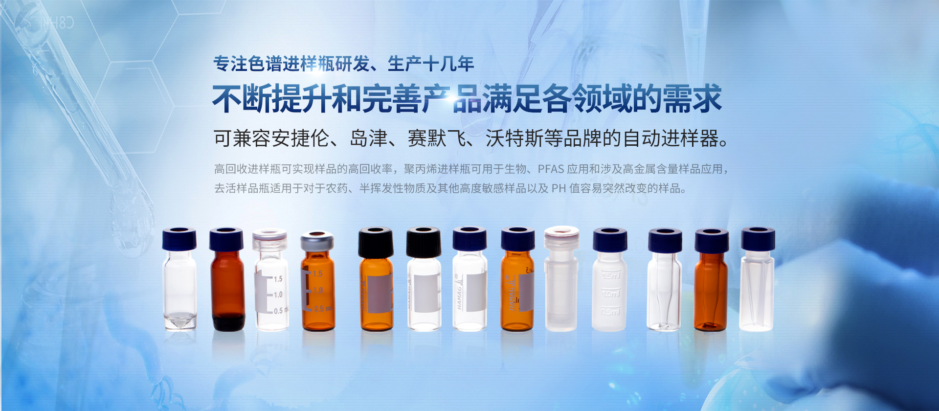 浙江哈邁科技有限公司(簡稱HAMAG),成立于2005年,總部位于美麗的海濱城市寧波,是中國優質色譜進樣瓶、樣品瓶供應商,是一家專業從事色譜耗材的科研、設計、生產、銷售和系統集成為一體的生產型企業。經過十幾年的研發與努力,通過和國內外多個科研部門,浙江大學理工學院,同時與品牌:安捷倫、沃特世、島津等公司的技術交流與學習,我們成功的研制開發出實驗室分析設備專用的各種型號的自動進樣瓶、頂空瓶及其配套蓋墊;特氟龍與硅膠復合墊片;特氟龍/硅膠制品;創新型固相萃取儀;針式過濾器等幾十種實驗室耗材及關聯產品...